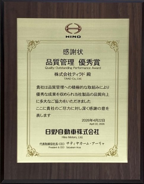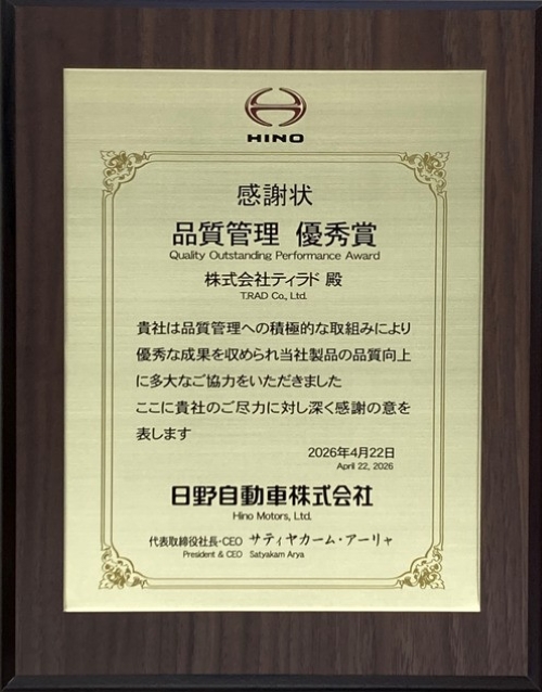 日野自動車株式会社殿より”品質管理 優秀賞”を頂きました。 2025年度の品質実績に対して評価頂いたことによる表彰となります。