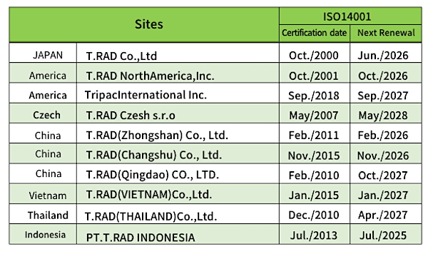 We strive to improve our environmental performance through the continuous enhancement of our environmental management system. Since 2011, we have been ISO 14001 certified company-wide in Japan, with domestic subsidiaries certified under Green Management and KES*, and our overseas manufacturing sites also certified under ISO 14001.