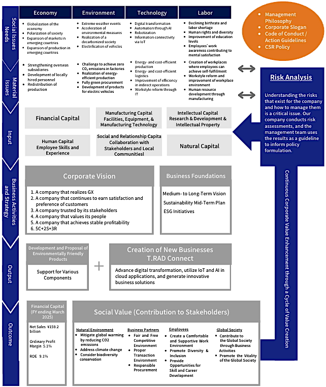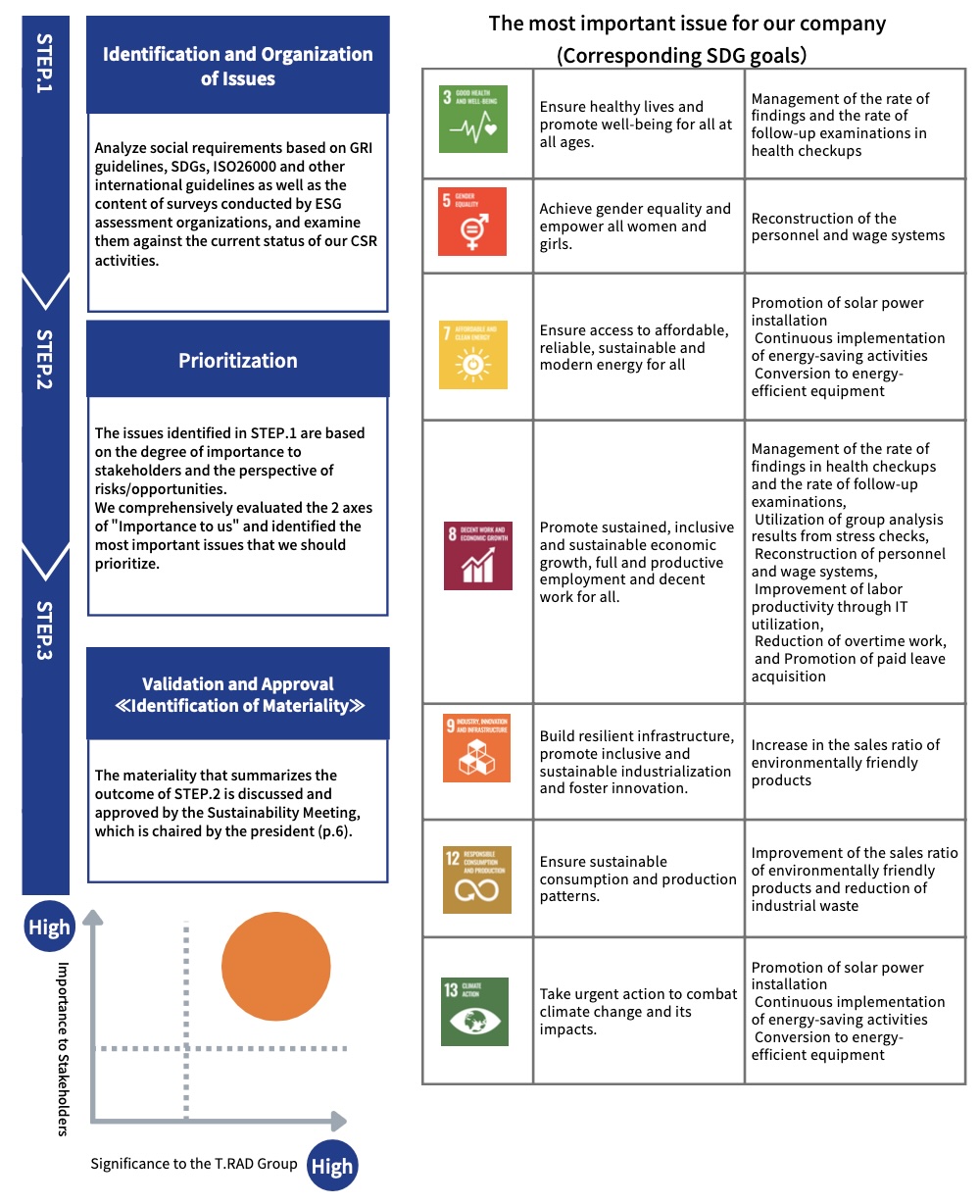 Our Group has defined a business structure that contributes to sustainable development by solving various social issues through our business activities and promoting the creation of common value with society. We will also contribute to the related SDGs goals by resolving selected key issues.